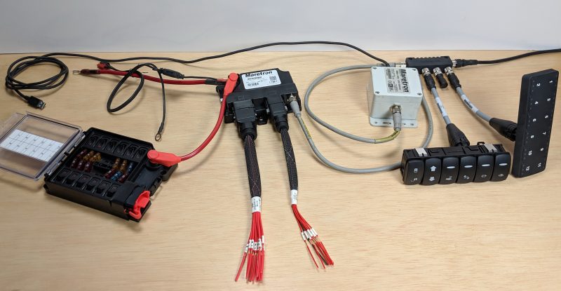 I’m closing with the final network I put together on my project bench before heading off on a late March vacation. It’s a more normal design than what you’ve seen above and you’re only seeing part of it because the black cable at upper right is backbone headed off to the lab’s base system and power drop. But, hallelujah, all the components shown are a demo kit of a powerful yet inexpensive Maretron MPower digital switching system that’s slowly rolling out.