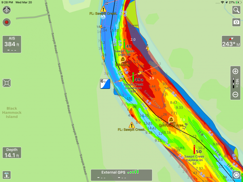 Aqua Map now supports receiving data from GPS, heading sensors, depth instruments, AIS receivers, and wind instruments via WiFi. Aqua Map can receive either NMEA-0183 formatted messages via TCP or UDP or SignalK messages. I have a Digital Yacht iKommunicate and a Yacht Devices YDWG-02 WiFi gateway onboard that are both compatible. Aqua Map automatically discovered the iKommunicate while I had to manually add the Yacht Devices gateway. Once connected Aqua Map notifies you that you will be disabling internal GPS within the app until you turn off the external data source and changes the GPS status box text at the bottom of the screen to show external GPS in use.