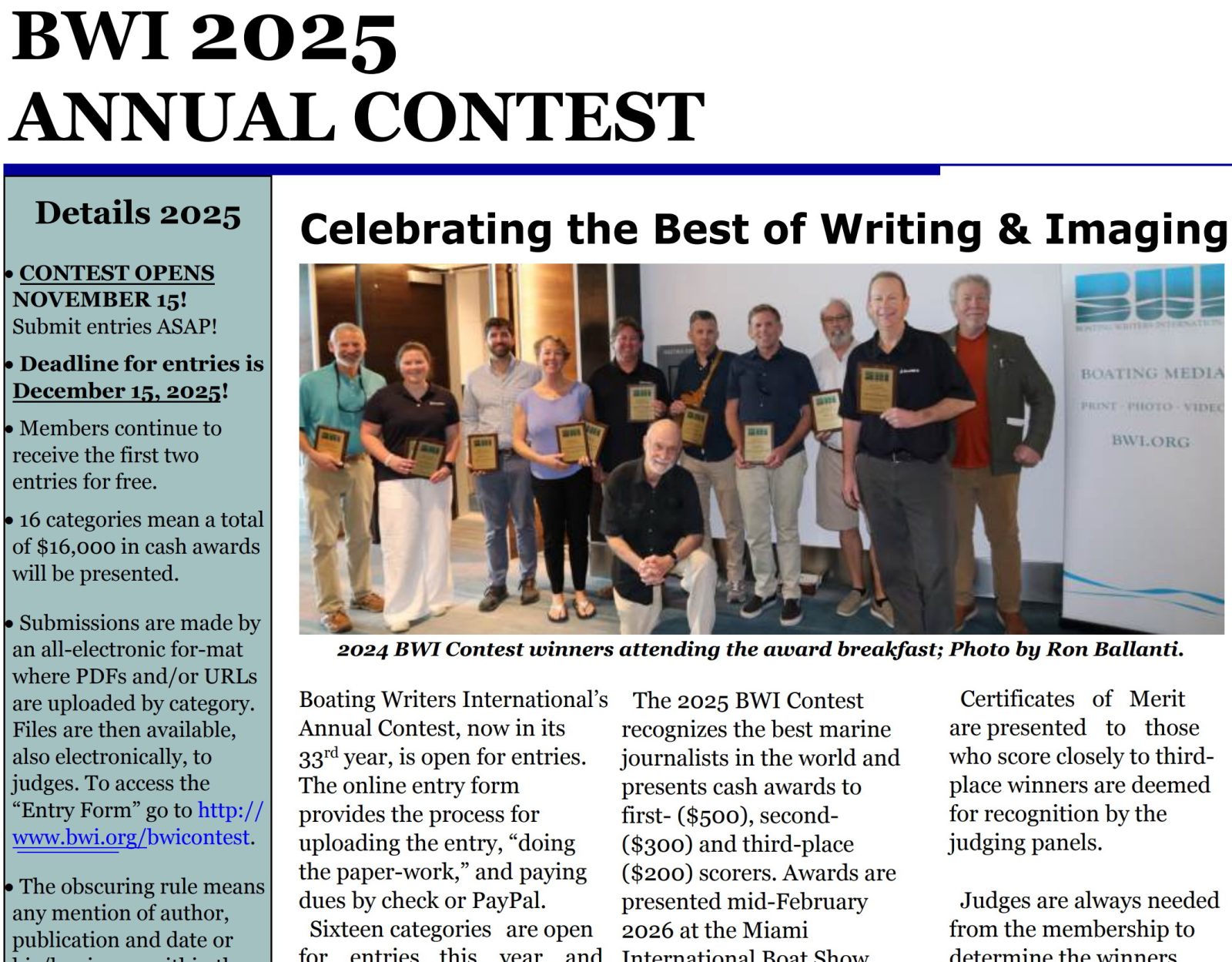 In BWI’s 2025 Contest, presentations in 16 contest categories representing $16,000 in cash awards were made to first ($500), second ($300) and third ($200) place scorers. Cash award recipients also received a recognition plaque noting their “Excellence in creating compelling content about boating through entertaining, educational and inspiring journalism.”
