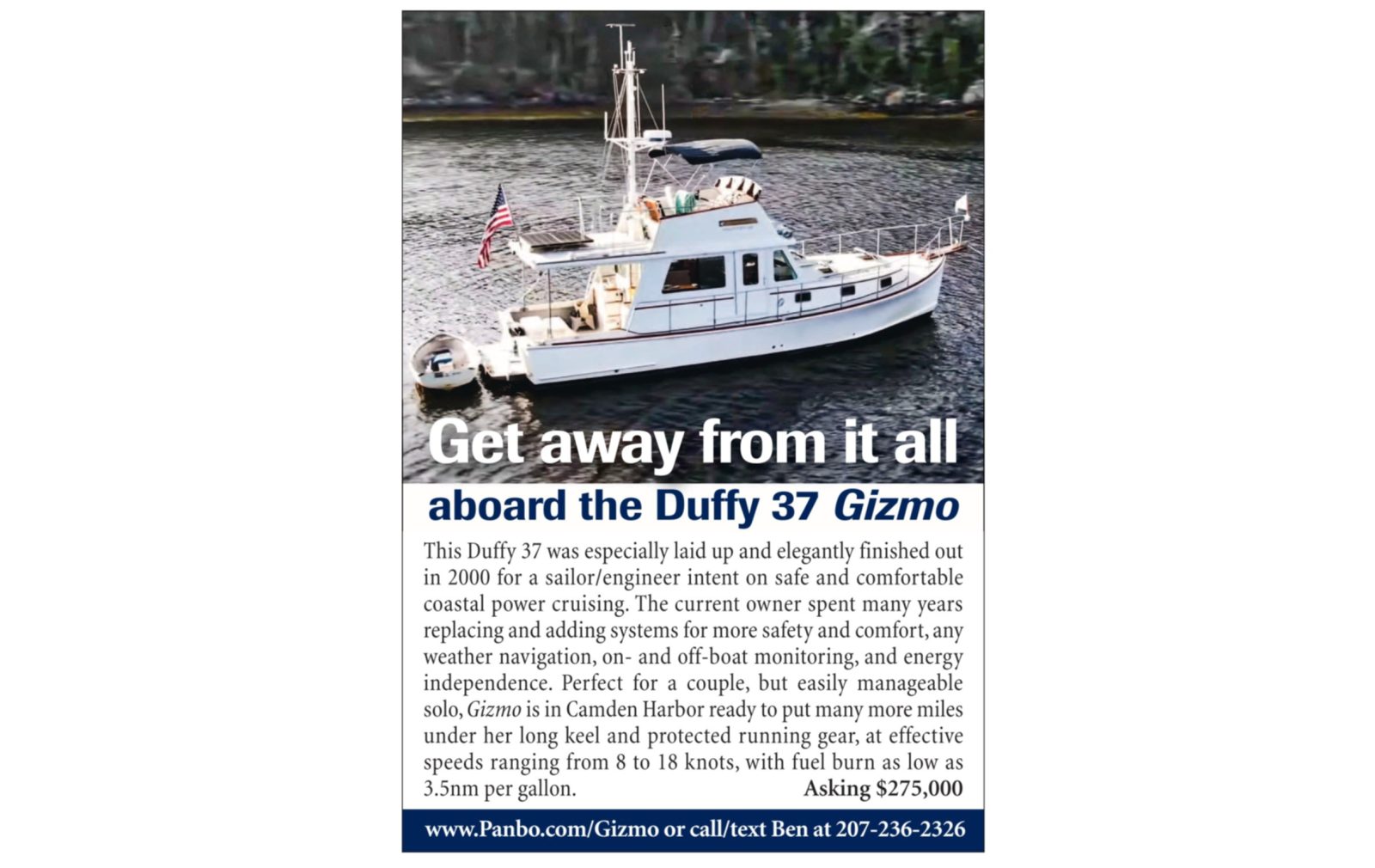 Meanwhile, there are few valid excuses for my lack of content creation, but this is one: I’m still trying to find a new owner for the wonderful Duffy 37 Gizmo now that Young Ben is Panbo’s primary electronics tester and I yearn for fewer boat responsibilities. Actually, one inducement MBHH offered was a sharp ad in their May/June print issue…