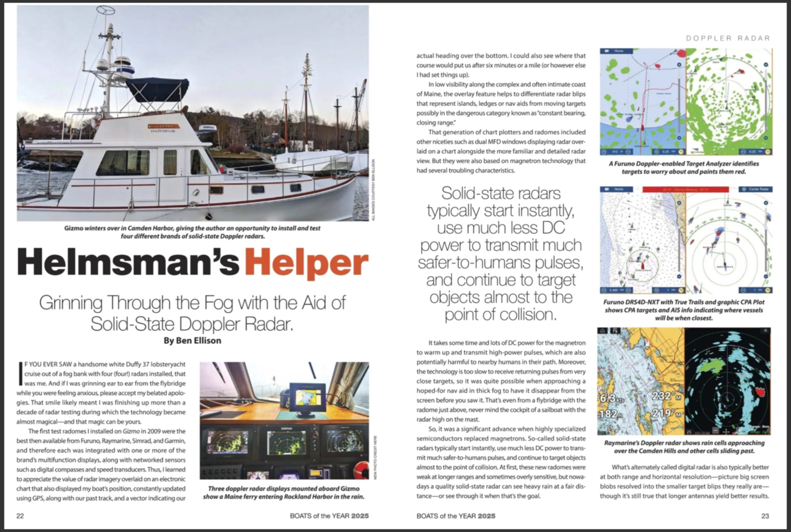 The radar roundup starts on page 22, but you may well enjoy other articles and/or the new boat profiles. Maine boatbuilding has enjoyed a significant renaissance in recent decades, and I feel fortunate to have observed that up close. I’d also enjoy feedback on my radar thoughts. It still takes user effort to get the most out of even the premium Doppler-assisted solid-state radomes now offered by all major brands, but I remain amazed at what they can do.
