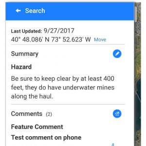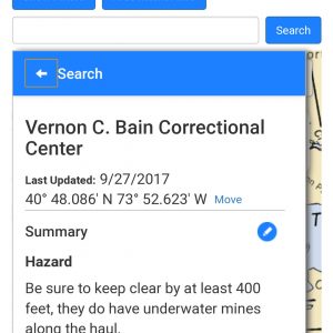 My Google Pixel2 XL Android phone does show the NOAA charts, which, incidentally, zoom into smaller scales than they used to. I’m heading up the always-interesting East River later today, but this will be the first time I was aware that the floating correctional center across from Rikers and La Guardia may have “underwater mines the haul (meaning hull, I think).”