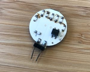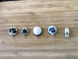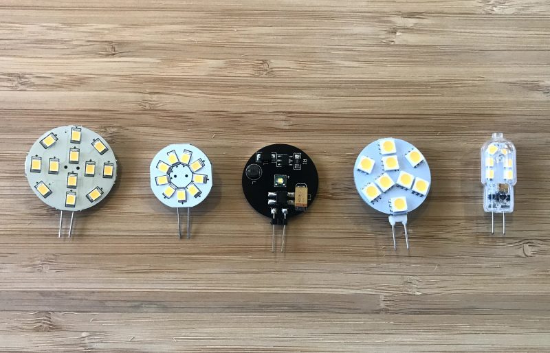 I’ve noticed the physical configurations of G4-LED-replacement bulbs has changed towards more tower (cylindrical) shaped bulbs and fewer of the flat discs. I’ve previously tried some of the tower-shaped bulbs and had trouble with them fitting in my fixtures. Some perusal of Amazon found what looked like workable disc-shaped bulbs as well as the halogen shaped bulb seen above. At $3/bulb for the flat disc 1.8 watt, 150-lumen bulb and $1.40/bulb for the halogen shaped 1.5 watt, 180-lumen bulb it was easy to give them both a try.