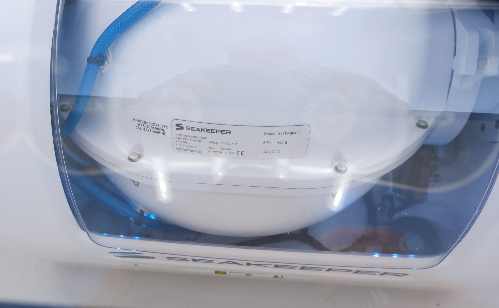 With the 1, Seakeeper has redesigned several aspects of the stabilizer to make installation easier and cheaper. The Seakeeper 2 and 3 the units could be mounted directly to the deck of a boat as long as the deck is glued to the stringer system of the boat, which I learned is a common construction technique. But with the 1, they’ve reshaped the flywheel enclosure so that it doesn’t hang below the frame of the unit. This means that the Seakeeper 1 can be installed on the deck of a boat without cutting out the floor below it. The entire unit occupies about the same space as a 65 quart cooler, so it fits under leaning posts, inside of seating and in the cockpit of many boats.