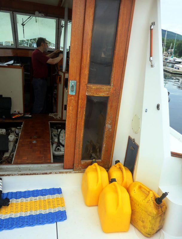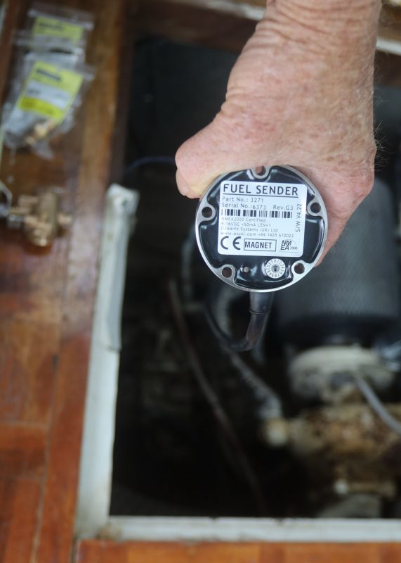 So when we rendezvoused last Saturday morning, Jud had the Axiom and the port tank sender temporarily installed on his NMEA 2000 network while the starboard sender was fully installed in the new and empty starboard tank. (How the port sender gets fitted into the tank that doesn’t need replacement remains a mystery). He’d also lugged in a lot of full five-gallon diesel jugs.