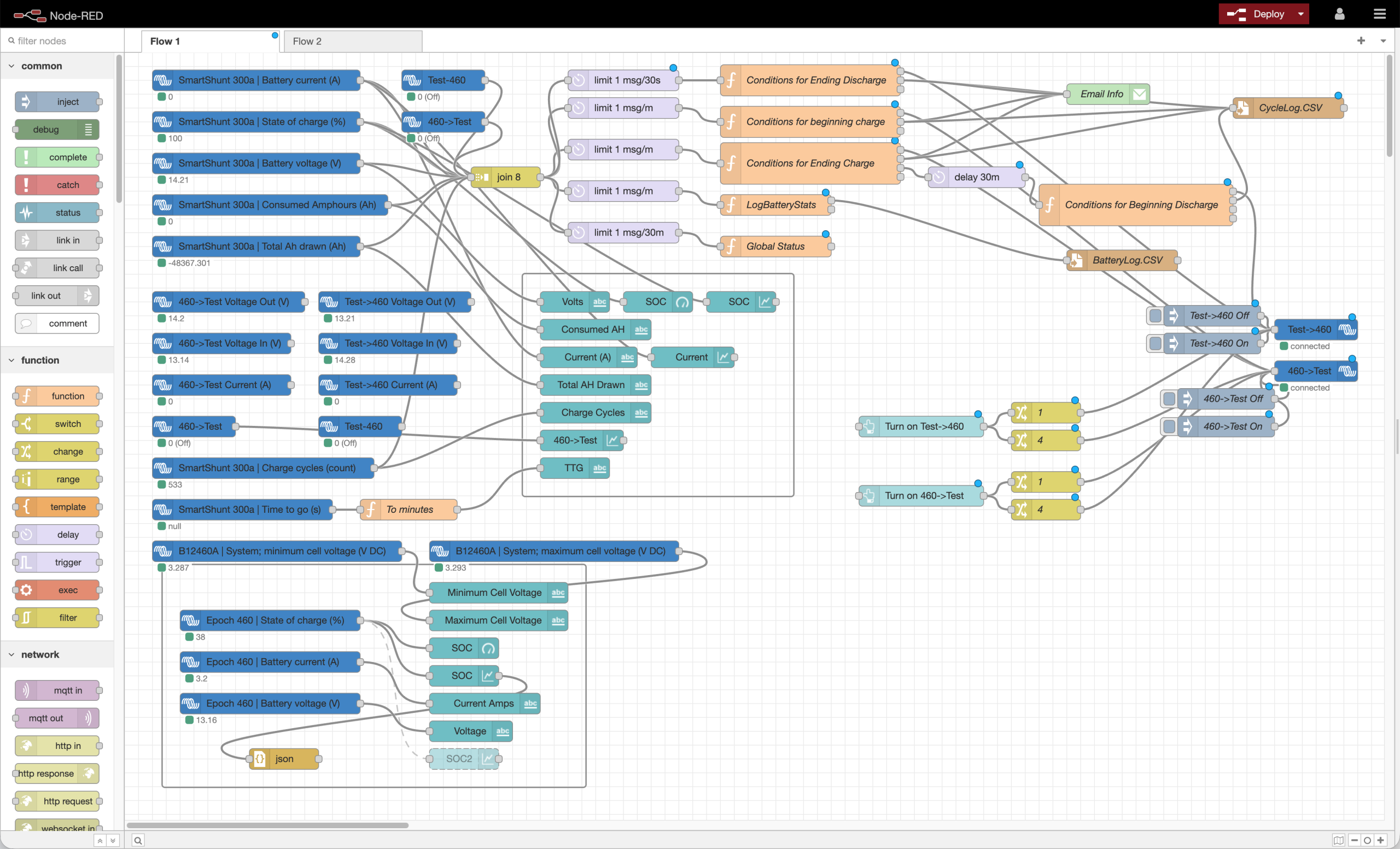 My test setup reads like a nice chunk of Victron’s catalog. I am using two Orion XSs, one sending energy from the 460ah energy storage battery to the test battery and the other sending energy the opposite direction. I am using a 300 amp SmartShunt to measure energy in and out of the test battery. Finally, a Cerbo GX monitors and controls everything. Node Red running on the Cerbo itself provides the automation I need to cycle the test battery repeatedly. Node-Red, the Node-Red dashboard and SignalK Server are all part of the Victron Venus OS large image. Installing those features is as simple as changing the image type on a Venus device’s — like the Cerbo GX — firmware menu.