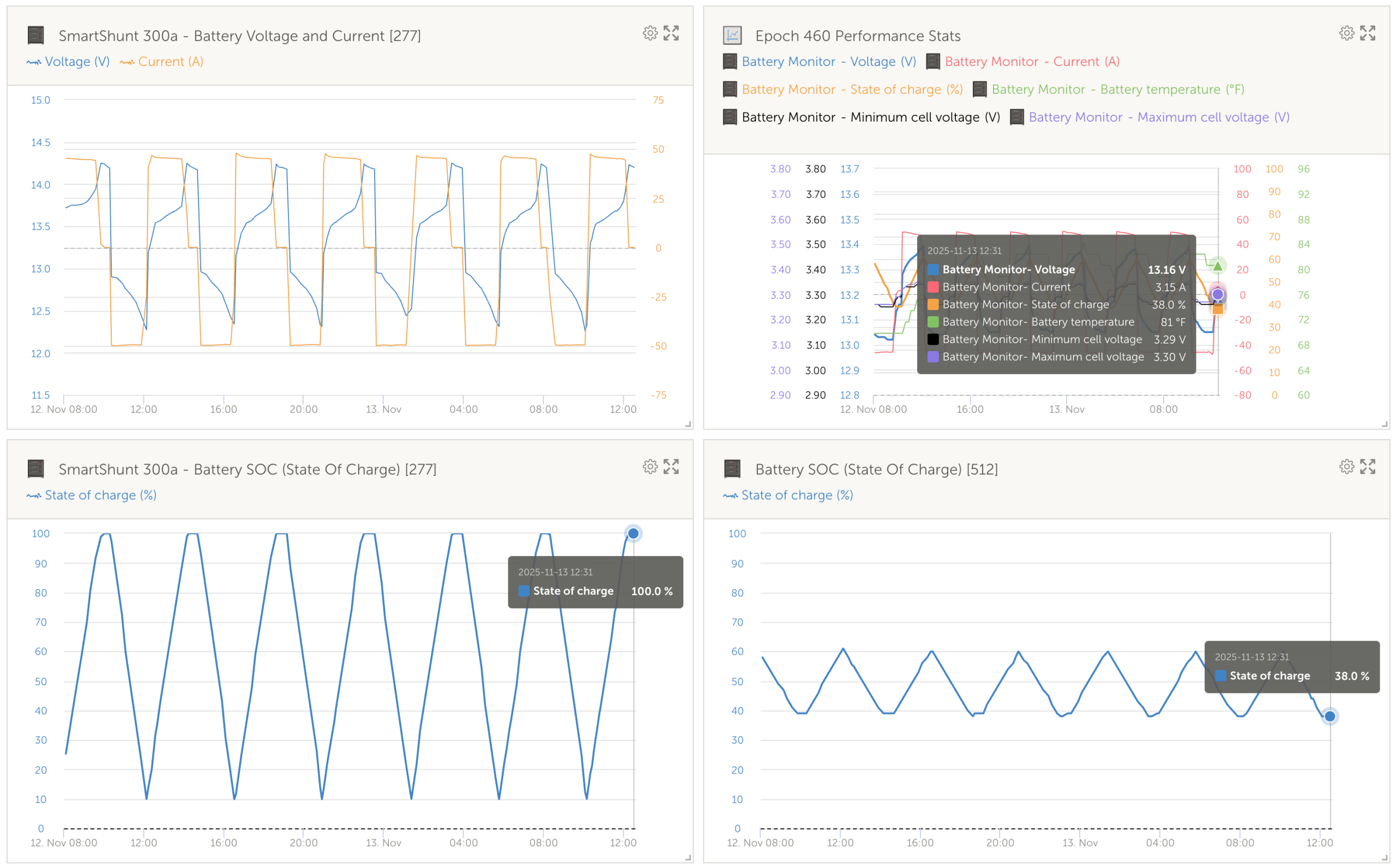 Testing starts with a full charge cycle from the 460ah storage battery to the test battery at 0.5c. Charging continues until SOC is above 99-percent and charge acceptance is below 0.2 amps. Once the battery is charged, the battery rests for 30 minutes. At the conclusion of the rest period, a 0.5c load activates and sends that energy to the storage battery. That continues until SOC on the test battery reaches 10-percent, as indicated by the SmartShunt. Once the test battery falls below 10-percent SOC, Node-Red turns off the discharge Orion and turns on the charging (460->test) Orion.
