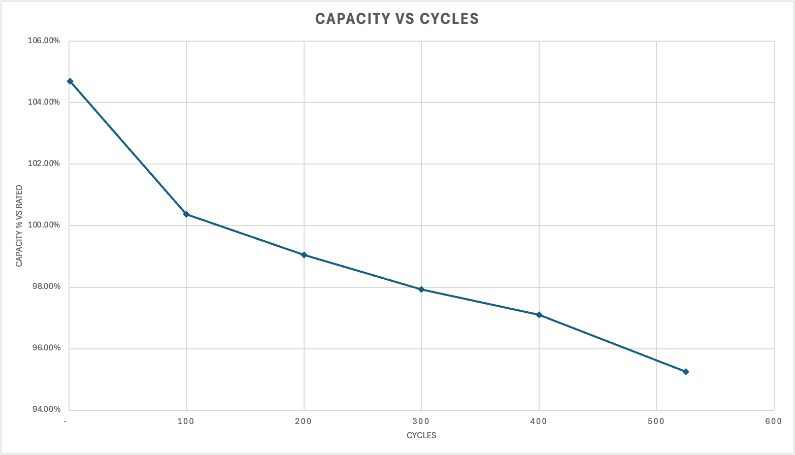 Updated December 2, 2025 — The battery reached 600 cycles and I’ve done another capacity test. Interesting to see the rate of decay slow and the predicted number of cycles increase for the first time. I am very curious to see what happens at 700 cycles and weather the plateau extends or if aging accelerates again.
