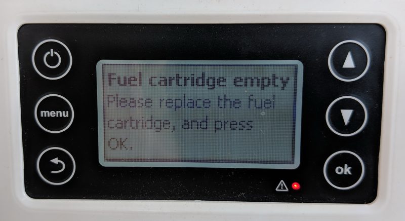 The apps are also useful if your EFOY ever generates an error code. You’re apt to see it on the panel first, but the app’s Service Tool lets you look up its meaning. Incidentally, I don’t know what caused the two high voltage alerts at hour 70, but they’re the last error messages I saw in what was eventually well over 200 hours of use. They were also the only error messages generated during my testing, though Gemeco had caused a couple of Error 11’s — “There is a problem with the air supply to the fuel cell” — while using the same Comfort 210 unit for demos before shipping it to Maine. I find it a comfort that the EFOY self-monitors many aspects of its operations and can shut itself down if it feels the need.