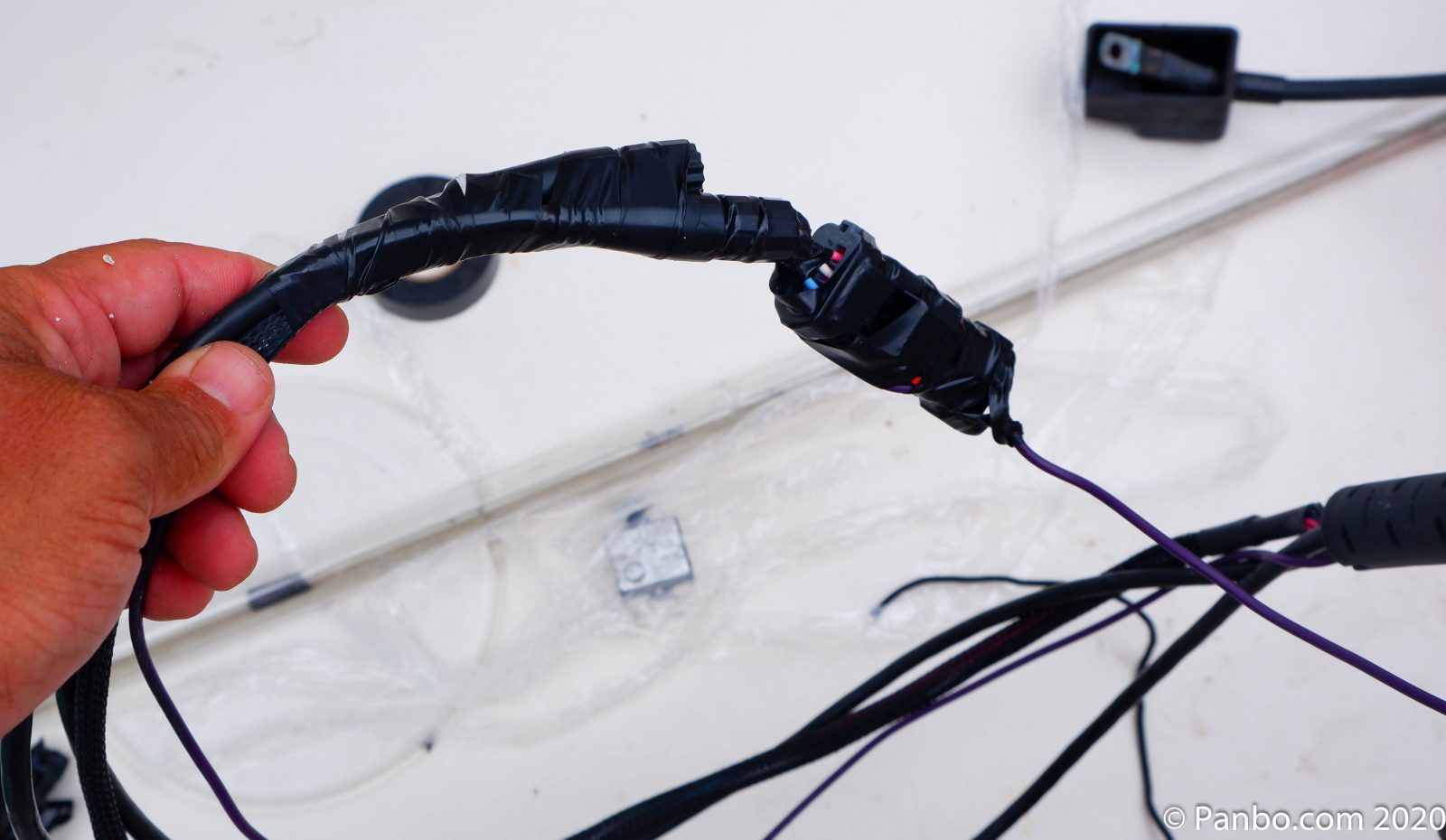 Before beginning the installation I was most concerned about the difficulty of pulling the relatively large wiring bundle through the boat. Fortunately Cobia built the boat with a 4″ PVC rigging tube (visible in the background of the left picture) that was only about half full. Between the relatively empty chase, the use of fiberglass wire fishing rods, and the assistance of my petite, 12-year old daughter Molly — who I parked upside down inside the console to grab the wire bundle as it came through — the wiring harness was quickly in place. I was fortunate there was lots of room in the wiring chase as the harness isn’t small and the large rectangular connector ahead of smaller diameter wiring can make for difficult pulling.