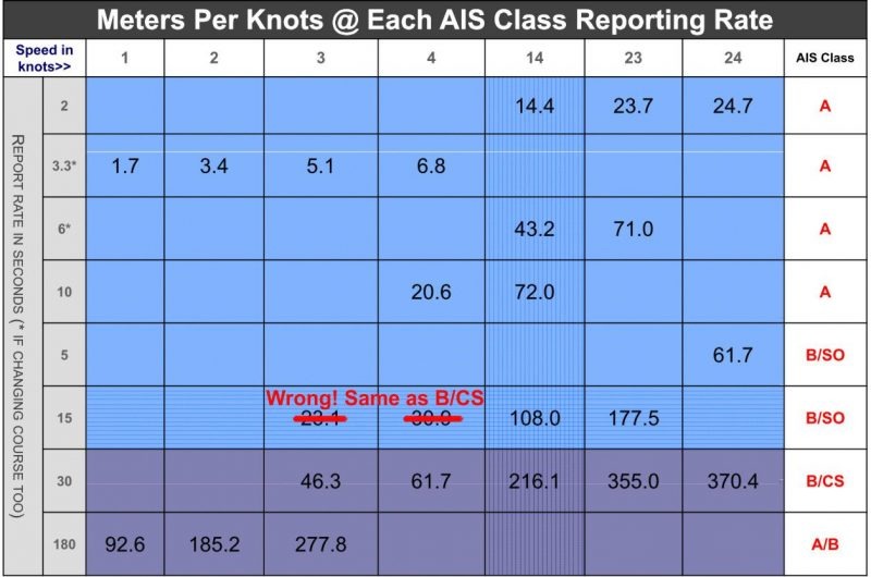 Correction 1/6/2020: This NavCen table was flawed. Class B/SO has the same 30-second transmit rate as B/CS up to 14 knots of vessel speed.